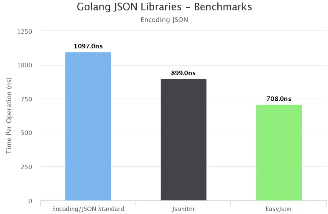 Go 有一个非常好的encoding包,它支持多种格式,比如json, XML, csv,但是快速浏览一下替代品会向你展示大量的库。我针对标准encoding/json包对 Jsoniter、EasyJson 进行了基准测试,结果如下。