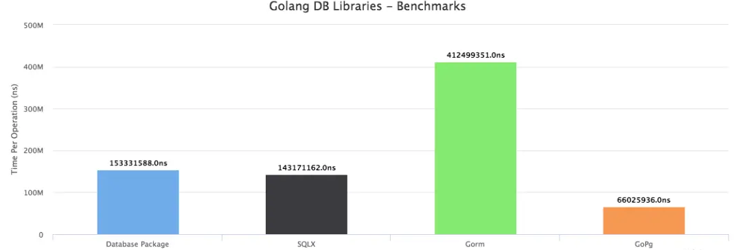 database, database + sqlx, gorm , go-pg 对查询进行了基准测试,下面是结果。令人惊讶的是,go-pgORM 的执行速度比标准包甚至sqlx还要快. GORM虽然在生态系统中非常有名,但速度相对较慢。