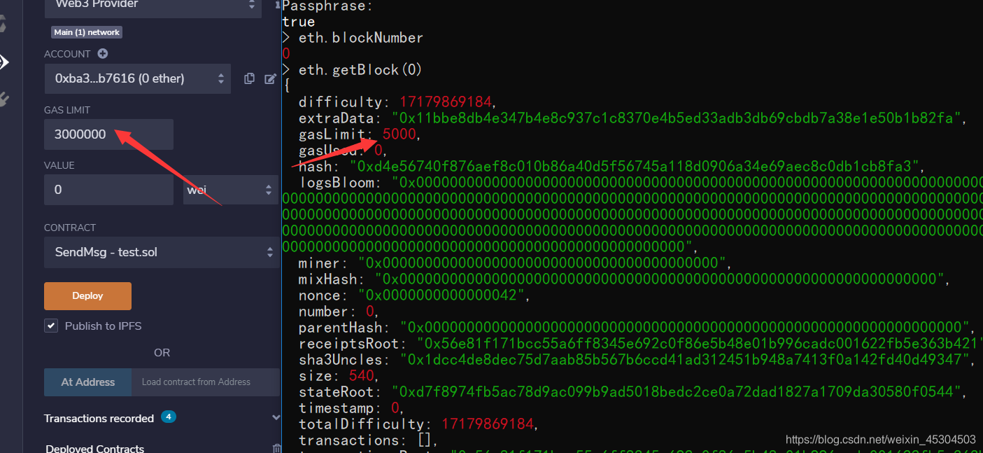 2 .Returned error: exceeds block gas limit:出现这种错误就看块号的gaslimit,部署时改成一直
