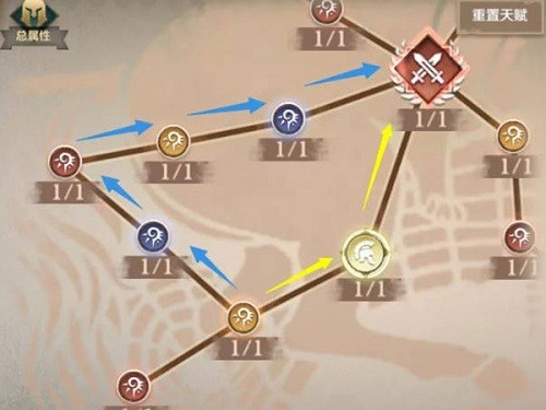 2:三种不同颜色的刻印石对应解锁相应的颜色的古卷天赋,除此之外还能使用辉煌刻印石抄近道,快速的解锁天赋,下图蓝色是常规路线,黄色就是捷径使用辉煌刻印石解锁;