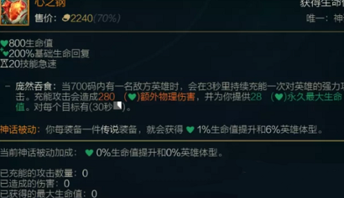 1、装备的基本属性是八百生命值,百分之二百的生命回复,还有二十的技能急速,这个都不是重点,重点是他的被动,拥有无限成长的效果。