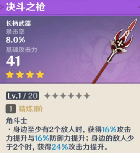 相比起前面三把武器,决斗枪的白值略低了一些,但换来的是更高的暴击率。之所以把它排到第四,实在是它的存在比较尴尬,武器效果提升攻击力和防御力,精5各提升32%,单个敌人提升攻击力,但稀释会比较严重。